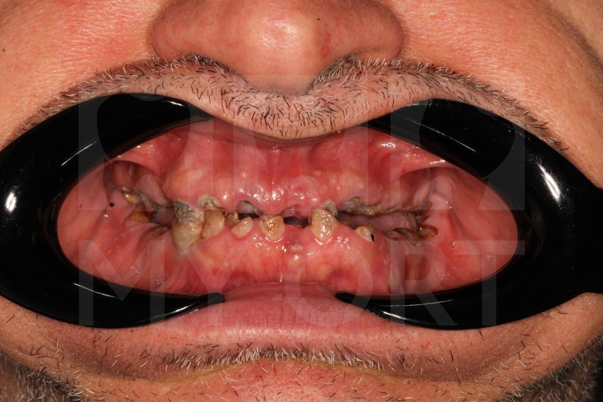 Представьте, что вы много лет не можете полноценно жевать, улыбаться или просто чувствовать себя уверенно из-за состояния своих зубов. Разрушенный ряд зубов и воспаленные дёсны приносят только дискомфорт и снижают качество жизни. В этой статье я, врач-стоматолог, ортопед, покажу вам реальный случай пациента, которому удалось вернуть красивую улыбку и комфортное жевание благодаря комплексному лечению по методике All-on-4. Как мы этого добились? Читайте далее. Пациент обратился ко мне на первичную консультацию с жалобами на невозможность нормально принимать пищу и отсутствие улыбки в течение многих лет. При осмотре полости рта было выявлено полное стирание зубов обеих челюстей, а также выраженное воспаление десен, что и вызывало сильный дискомфорт у пациента. Рентгенологический анализ показал, что зубы не подлежат сохранению. Следующим шагом стало составление комплексного плана лечения. На основании проведенной диагностики мной был составлен комплексный план лечения: 1. Полная санация п