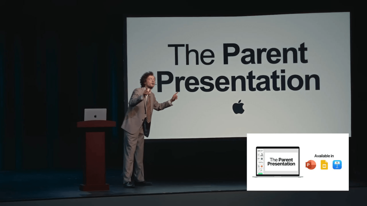 Особенность видео — ироничный ультра мега гипер кринж: ролик специально сконструирован для максимального высмеивания идеи, что студентам вообще надо уговаривать родителей на макбук. Тут и идиотские шутки, и максимально неловкий герой-лектор, и сама презентация, которую официально разместили на сайте Apple для скачивания и модификации: там 81 слайд.