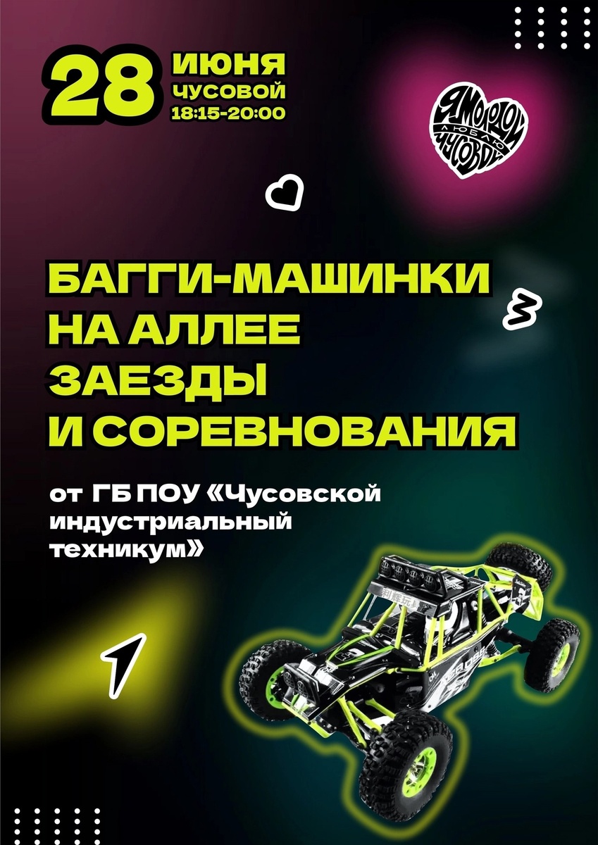 🔥Дорогие друзья! Приглашаем вас принять участие в увлекательных соревнованиях багги-машинок в рамках Дня Молодежи! 🗓28 июня с 18:15 до 20:00 📍на Аллее Молодежи! 🚗 Наслаждайтесь захватывающей атмосферой скорости и адреналина вместе с нами! 📌 Регистрация участников доступна по специальной ссылке — https://forms.yandex.ru/u/684ffa57068ff067a0077e2c/ поспешите занять своё место среди гонщиков! Возраст 14+ Ждем всех желающих окунуться в мир автоспорта и зарядиться позитивными эмоциями! #культура@glavachus