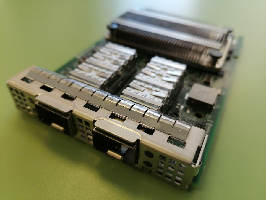 Broadcom BCM957412N4120DC – это двухпортовый сетевой адаптер с пропускной способностью 10 Гбит/с, работающий через интерфейс PCI Express 3.0 x8 и соответствующий спецификации Open Compute Project (OCP) 3.0 в компактном форм-факторе с двумя сетевыми разъемами SFP+. Адаптер поддерживает оптические модули SFP+ и медные кабели Direct-Attach. В основе устройства используется MAC-контроллер Broadcom BCM57412 с поддержкой 25GbE. Данная модель является аналогом BCM957412N4120C, предназначенным для серверов Dell. Распознаётся iDRAC и Lifecycle Controller. Об OCP замолвим слово Сообщество Open Compute Project — организация, участники которой обмениваются идеями и разработками для современных дата-центров. Решения, предлагаемые в рамках Open Compute Project, распространяются по аналогии с Open Source, т.е. бесплатно. Плата выделяется наличием выступа для замка, который не даёт случайно или намеренно извлечь плату без вскрытия корпуса. На плате установлен радиатор, обеспечивающий охлаждение контро