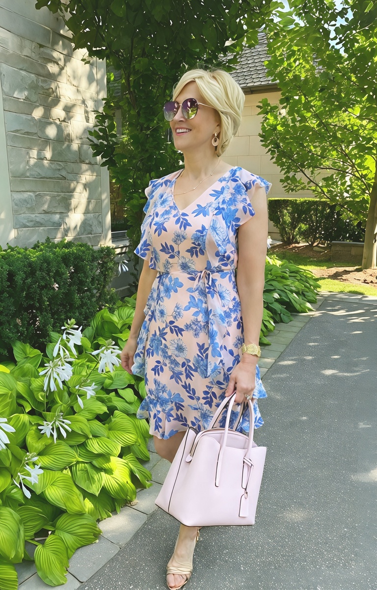 - Платье с пастельными цветами + кардиган. Для прогулки: пастельное платье, льняной кардиган, шляпа, сандалии. Лёгкий, свежий образ, молодит в дневном свете.