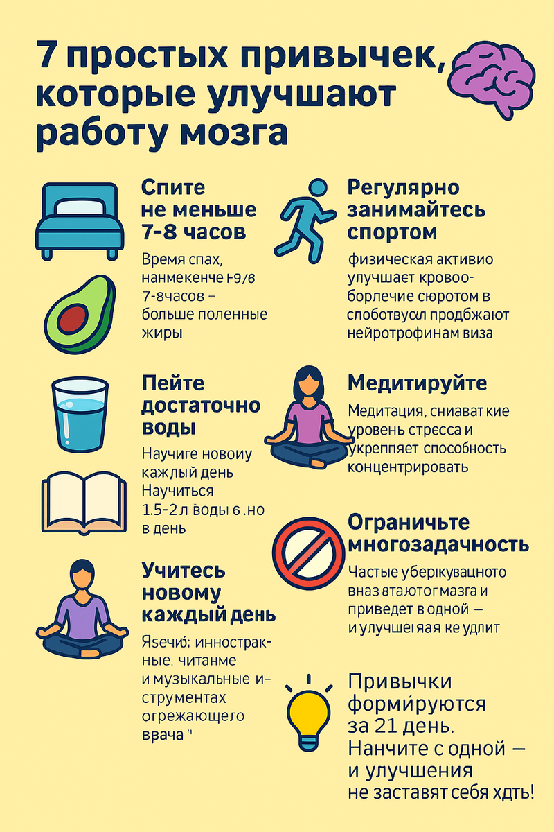 Во время сна мозг «перезагружается», формирует воспоминания и избавляется от токсинов. Хроническое недосыпание снижает когнитивные функции. 2. Ешьте полезные жиры 🥑