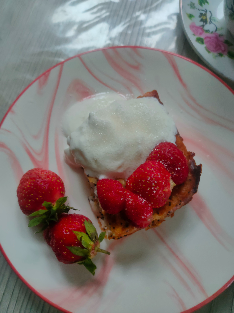 А что же сегодня было у нас на завтрак? Еще в прошлые выходные я делала творожную запеканку, половину мы съели, а вторую половину я заморозила, ели ее со сметаной и свежими ягодами клубники.