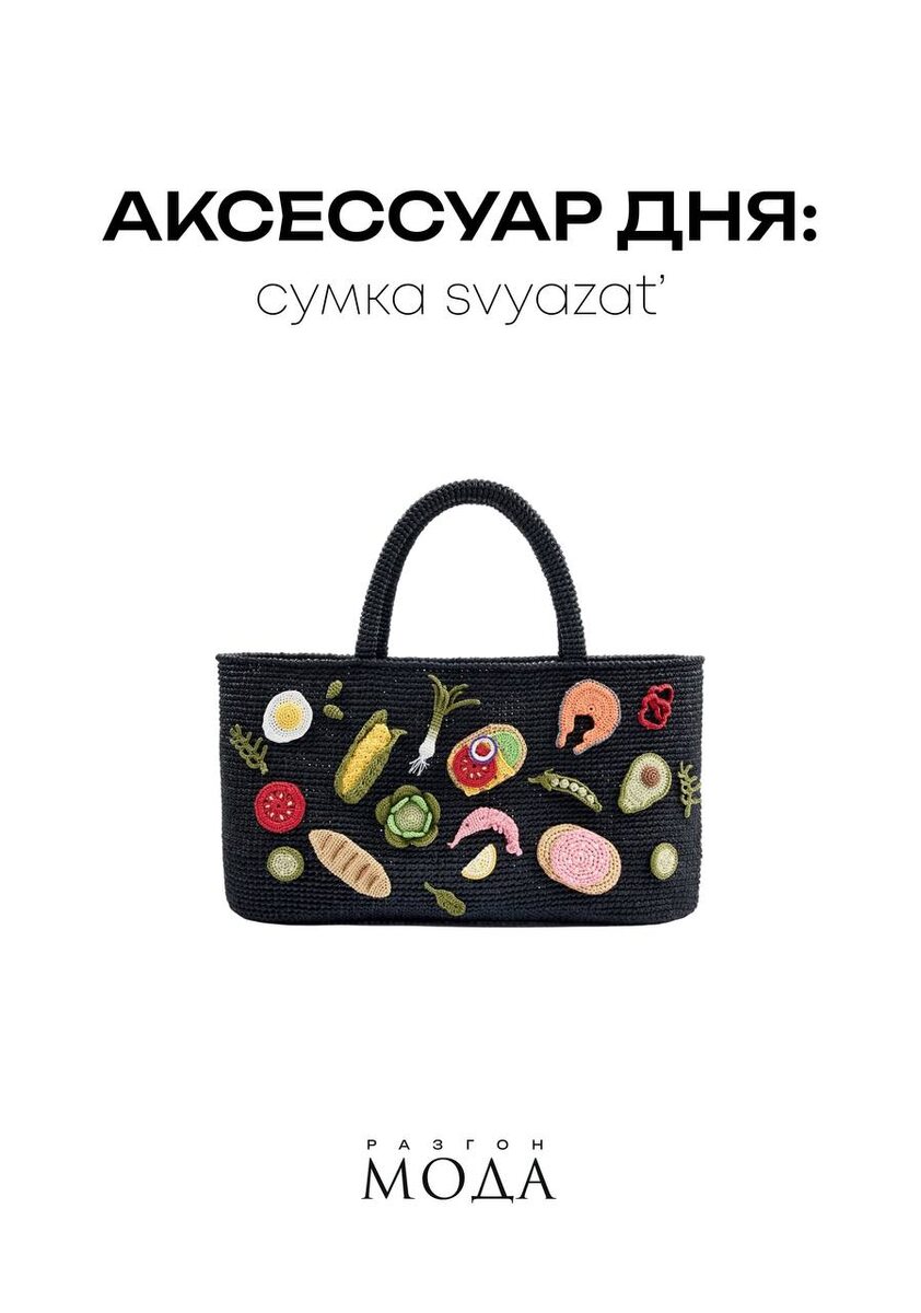 Кажется, бренд svyazat’ сделал буквально самую вкусную сумку сезона. Большой черный шоппер, сплетённый из рафии, украшен вязаной «едой»: здесь и креветка, и авокадо, и яйцо, и кусок хлеба. Каждую аппликацию мастерице пришлось вывязывать вручную. На это ушло 32 часа и килотонны терпения. Но результат стоит каждого стежка. Объёмные аппликации добавляют фактуры, сама сумка очень вместительная, а настроение — на 100% летнее. #РазгонМода_ВещьДня
