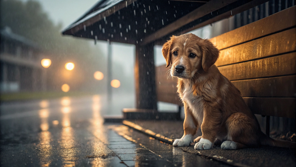 Под лавочкой, в углу, сидел щенок. Месяца два, не больше. Рыжий с белыми лапками. Мокрый насквозь, дрожит. Глазки чёрные, большие. Смотрит и тихонько скулит.