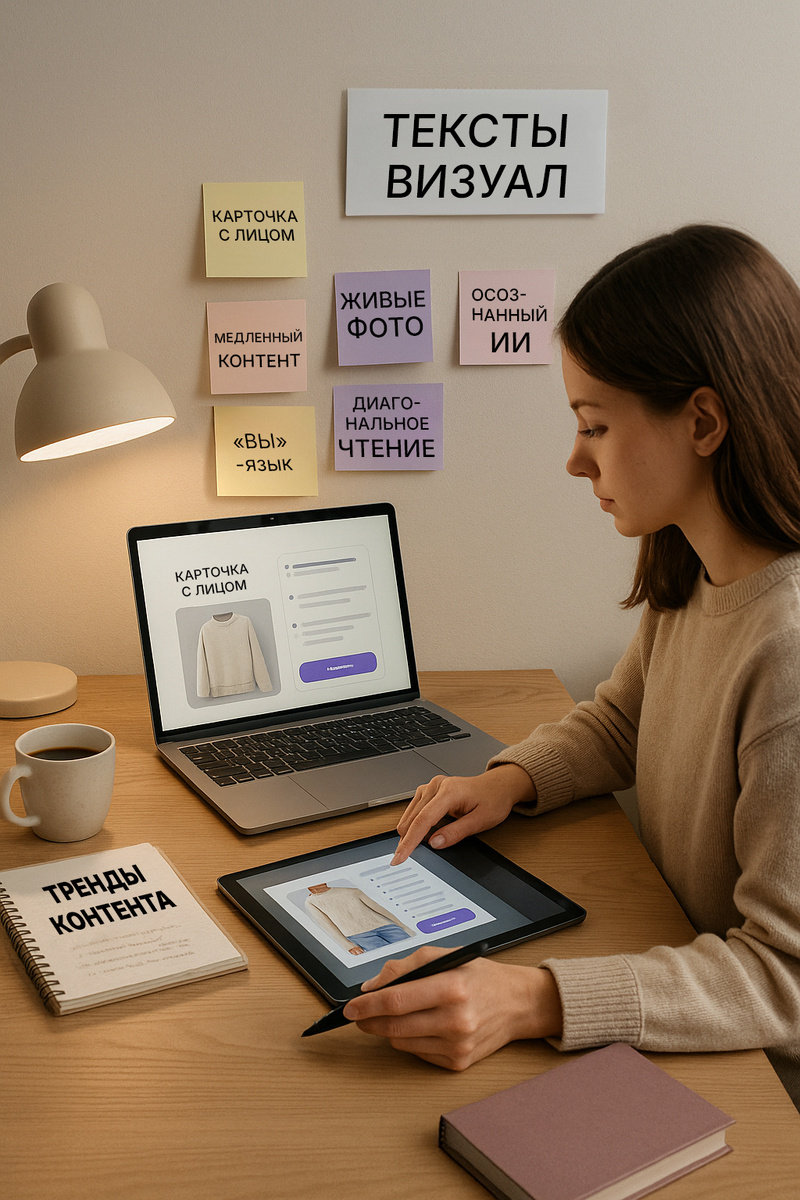 Замыслила я серию постов про тексты/инфографику в карточках товаров на маркетплейсах. Но пока собиралась, поняла, что тексты и визуалы - это просто средство. Самое сложное - понять, ЧТО сказать. А уже потом - КАК, какими средствами. Поэтому посты будут про контент карточек в целом. Про тексты и визуалы. Начну с глобального - с трендов. С начала года я купила 3 курса и книгу у Майи Богдановой. И, кажется, это не конец. Майя знает и умеет в текстах всё, но никакого отношения не имеет к маркетплейсам. На курсе по нейрокопирайтингу все нормальные люди учились по-другому писать посты в своих каналах или даже книги. Я же пишу посты, как умею, зато придумала, как всё переложить на карточки маркетплейсов. И это прямо круто. Особенно, когда я увидела, что принципы работают не только на текстах/инфографике, но и на визуалах тоже. А начну с трендов SMM от Майи Богдановой в моем переложении на карточки товаров. 1. Люди устали от формулы "Боль больше боли". Те, кто проходил мастер-класс по структу
