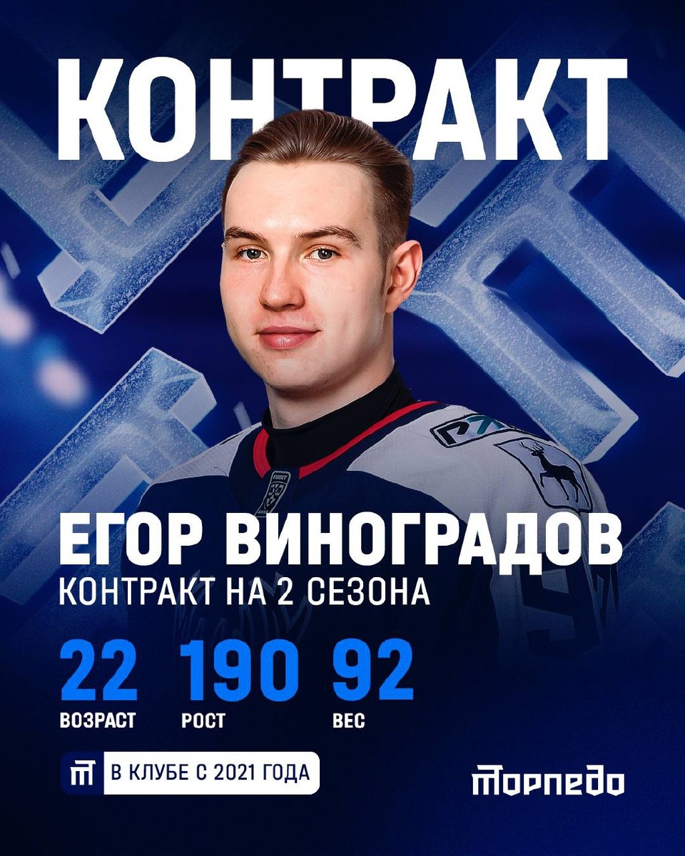 Хоккейный клуб «Торпедо» продлил контракт с нападающим Егором Виноградовым. Новое соглашение рассчитано до 2027 года🏒 Воспитанник нижегородского хоккея дебютировал за основную команду в сезоне 2021-22 годов и провёл за «Торпедо» 148 матчей, набрав 50 очков по системе «гол+пас». Параллельно, выступая за другие команды торпедовской вертикали, нападающий стал обладателем главных трофеев Молодёжной (в 2023 году в составе «Чайки») и Всероссийской (в 2025 году в составе «Торпедо-Горький») хоккейных лиг. 💬 Евгений Забуга, генеральный менеджер «Торпедо»: «Продление контракта с Егором - это важный шаг для нас. Он хороший пример развития профессионального хоккеиста в Клубе - от воспитанника спортивной школы до команды КХЛ. Мы верим в его потенциал, в способность расти и развиваться вместе с командой, став одним из ее лидеров» Поздравляем Егора с новым контрактом и желаем ярких побед в составе «Торпедо»!