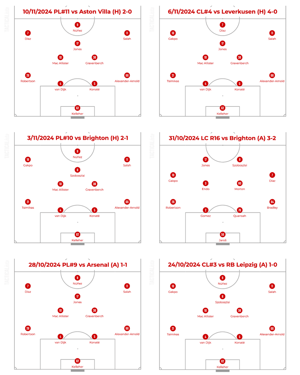 Салах на правом фланге и Гакпо/Диас на левом при этом становятся основными завершителями, сужаясь в центр и заполняя штрафную площадь. Опорная зона будет состоять из Гравенберха как единственного опорника, с Собослаем и Мак Аллистером в роли «восьмерок», поддерживающих Виртца.