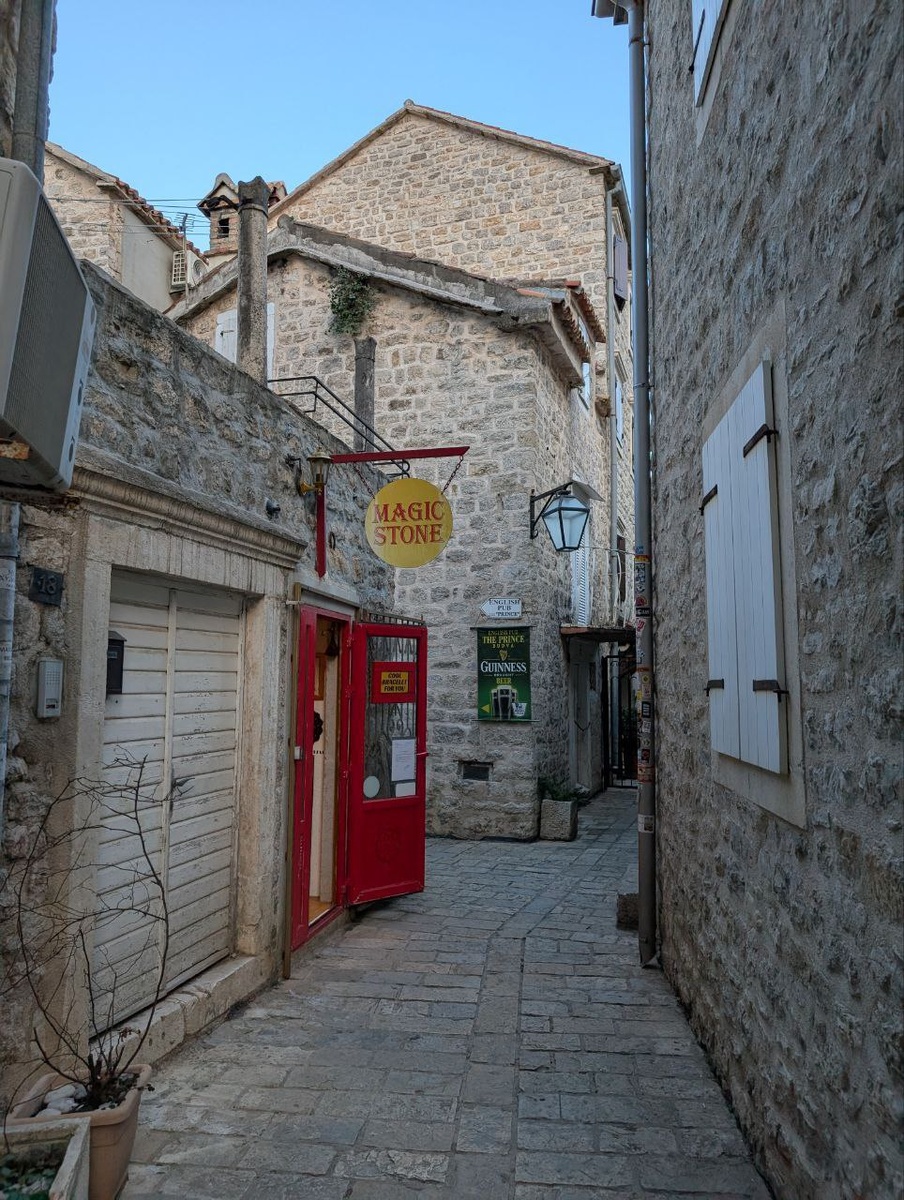 Будва. Старый город. Черногория. 28.04.2025 Рассказывает Саша: Красиво — узкие улочки, куча ресторанчиков и сувенирных магазинов, под шум моря, звуки скрипки и гитары.