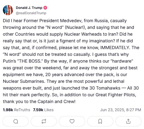 Trump reacts to Medvedev: 'Did he really say countries would supply nuclear warheads to Iran? If confirmed, let me know IMMEDIATELY