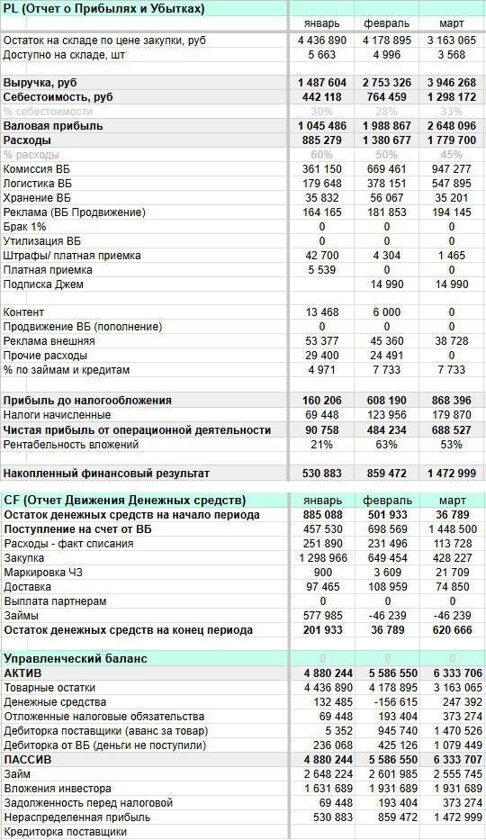 Кейс частый, на нем обычно влетают в кассовый и быстро уходят в банкротство, но можно вырулить. Сначала замедлить падение, потом плавно приземлить и можно даже продолжать лететь. Анализируем бизнес обычнопо основным отчетам ОПИУ, ДДС, Баланс и юнит-факт. Шаг 1. Изучаем текущее состояние по Отчёту о Прибылях и Убытках (PL): —Выручка выросла в 2,5 раза (с 1,4 млн до 3,9 млн руб.); — Расходы тоже пошли вверх, особенно на рекламу и хранение товара, потому что часть того, что не берут оседает помимо увеличения основного оборотного ассортимента на 40%; — Чистая прибыль растет не так быстро, как выручка. — Рентабельность вложений колеблется от 21% до 63%. Шаг 2. Изучаем Движение Денежных Средств (CF): —В январе и марте хороший денежный остаток, но: а) его не размещают на короткие депозиты; б) замедление по чистой прибыли и рост расходов, а так же поспешные закупки съедают капитал, поэтому: — В феврале на счетах почти 0 (36 тыс. руб.) — и кассовый разрыв. Шаг 3. Изучаем баланс: —Осн