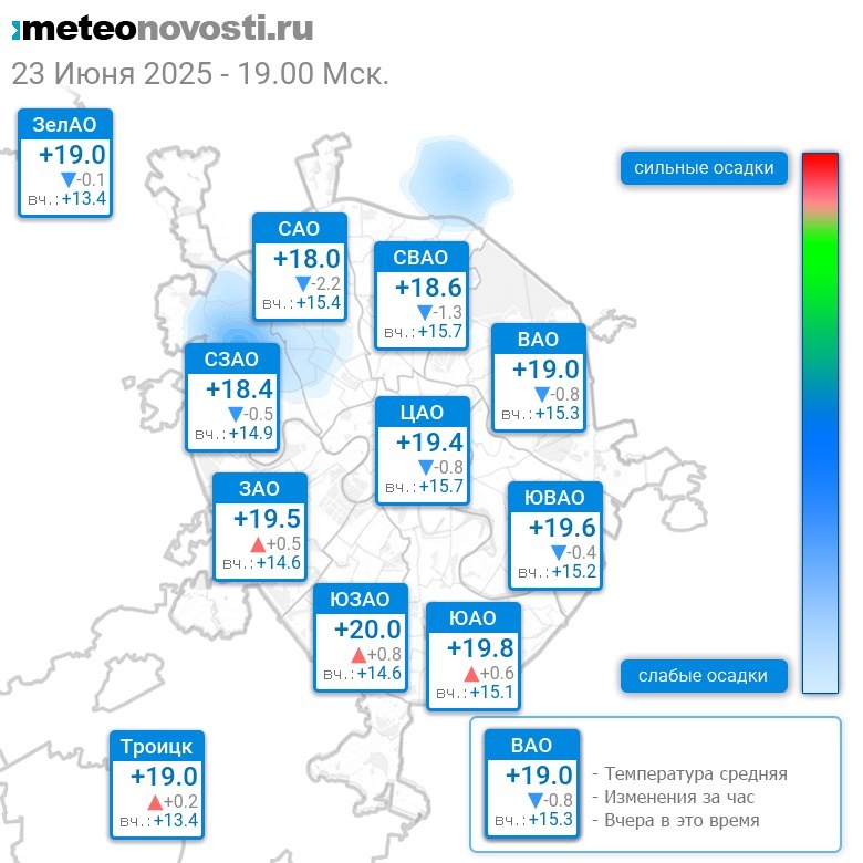 В 19:00 в Москве было от +17.2°C до +21.1°C, средняя температура +19.1°C #погода #Москва #лето #температура #23июня #понедельник