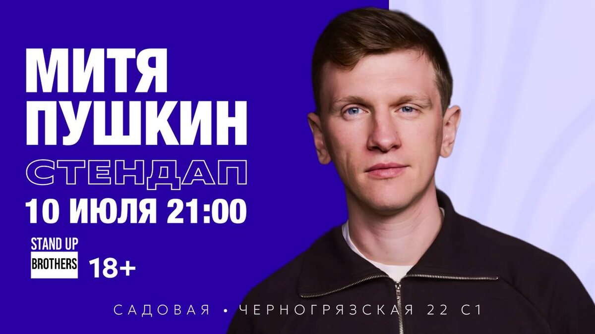 Сольный концерт Мити Пушкина в Brothers - 10 июля🎙️ Комик, получивший первую славу как двойник Лёхи Щербакова в Камеди Баттле на ТНТ, построил не менее успешную карьеру и с собственным стилем: стал участником Стендап-фестиваля на ТНТ и объездил множество городов с концертами. Час бодрой, смешной и заразительно энергичной комедии нас ждёт! Билеты по 750р уже в продаже 🎫