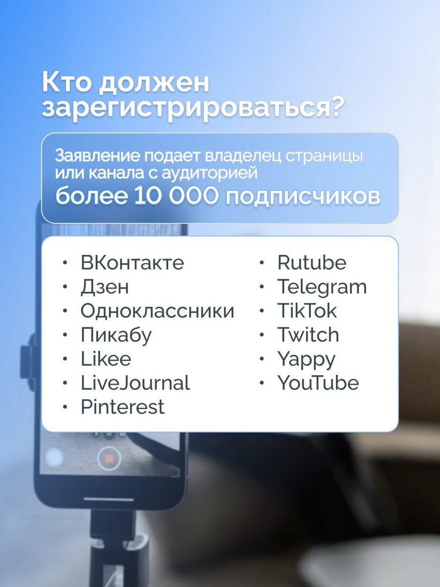 В России действует закон о регистрации блогеров Владельцы каналов и страниц в соцсетях с аудиторией от 10 000 подписчиков обязаны подать сведения в Роскомнадзор. Кому нужна регистрация, как подать сведения и что будет, если вовремя этого не сделать – читайте в наших карточках