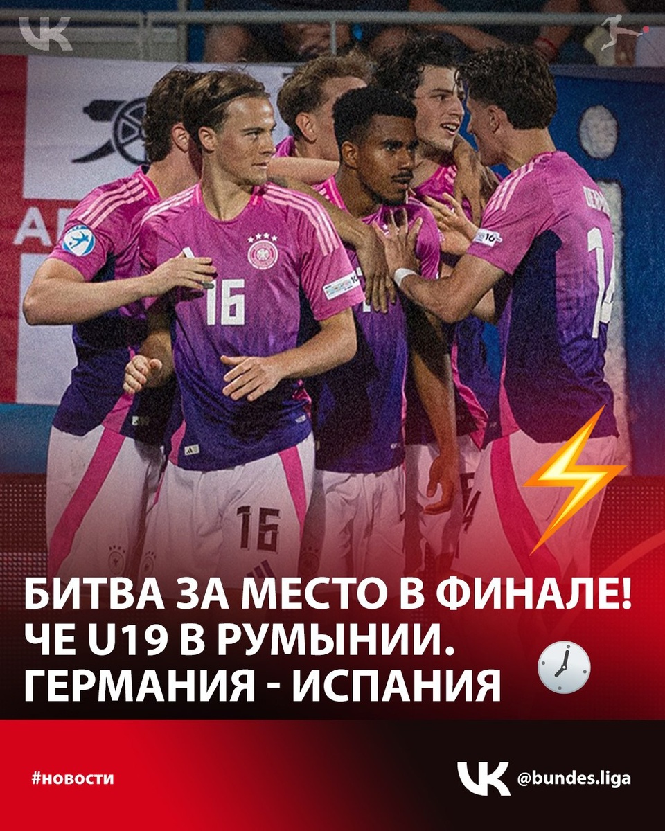 Битва за место в Финале! 🔥 Сегодня важный на Чемпионате Европы U19 в Румынии. 🇪🇸 Сборная Испании U19 будет биться с молодыми 🇩🇪 немцами U19 в рамках турнира в Румынии в 1/2 финала. Начало встречи 23 июня 2025 года запланировано на 18:00 по московскому времени. Напомним, Германия в третьем туре с трудом 🥴 вырвала победу у Норвегии и еле вышла в полуфинал турнира. В то время как Испания идёт без потери очков и с первого места вышла в 1/2 финала 👏 Во втором полуфинале Румыния сразится с лидером группы B - Нидерландами, которые также как и сборная Испании выиграла все матчи на турнире до сегодняшнего дня. Нас ждут интересные противостояния, друзья! 😃 ⚽⚡