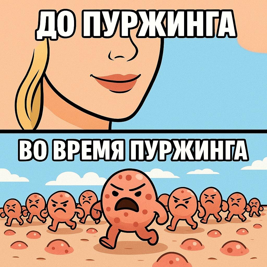 «Тебе обещали мгновенную красоту? Ну да, конечно…» Короче о главном: пуржинг (от англ. purging – «очищение») в дерматологии – это не аллергия и не вечные прыщи, а временная генеральная уборка кожи под действием активов. Как это работает • Ускоряем «конвейер» – ретиноиды, кислоты (AHA, BHA), ферментные пилинги и микродермабразия взвинчивают скорость отшелушивания (обычно 28–42 дня). • Выносим на свет божий скрытые комедоны и субклинические воспаления. • Аналогия: представляешь, что старые пробки и «пьяные» клетки вываливаются из-под ковра, чтобы дать дорогу новеньким. Что и когда ждать • Появление высыпаний: на 2–6-й неделе после старта. • Локализация: привычные «горячие точки» твоей кожи. • Продолжительность: максимум 6–8 недель, то есть 1–2 цикла обновления. Это не пуржинг, а… • Аллергия или раздражение (при ней сыпь и зуд могут гулять куда угодно и долго не проходить). • Поствоспалительная пигментация или фолликулит из-за неправильного ухода. Что делать дальше 1. Терпение и