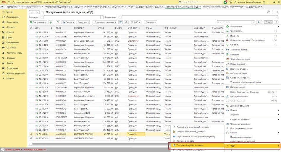 Обратите внимание! Для загрузки в «1С:Бухгалтерию 8» файлов в формате xml можно использовать 1С-ЭДО, даже если он не подключен. Для этого нужно в форме списка журнала документов Поступление (акты, накладные, УПД) в меню Еще выбрать пункт ЭД