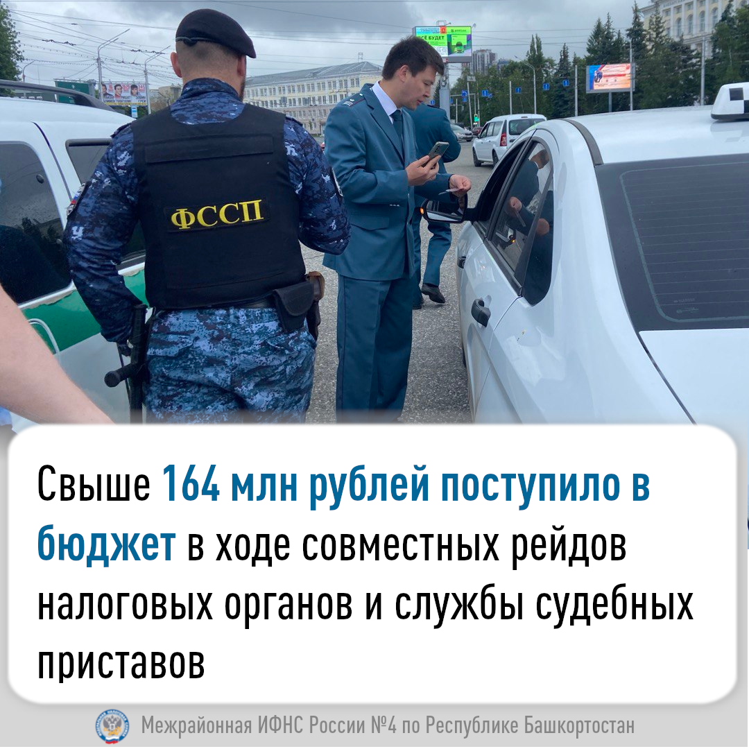Свыше 164 млн рублей поступило в бюджет республики в ходе совместных рейдов налоговых органов и службы судебных приставов Налоговыми органами совместно со службой судебных приставов, центром организации дорожного движения и сотрудниками ГАИ на дорогах республики проводятся рейдовые мероприятия по выявлению должников по налогам и штрафам ГИБДД среди владельцев транспортных средств. В транспортном потоке по автомобильным номерам выявляются должники, к которым применяются меры по изъятию денежных средств и наложению ареста на имущество, принудительная эвакуация транспортных средств на специализированную стоянку. Так, в первой неделе июня в ходе очередного рейда в Уфе в транспортном потоке были выявлены 75 граждан, имеющие неисполненные обязательства по налогам и штрафам ГИБДД. Произведено 3 ареста транспортных средств. Во избежание мер принудительного воздействия некоторыми должниками задолженность была оперативно погашена. С начала 2025 года судебными приставами арестовано свыше 800 объ
