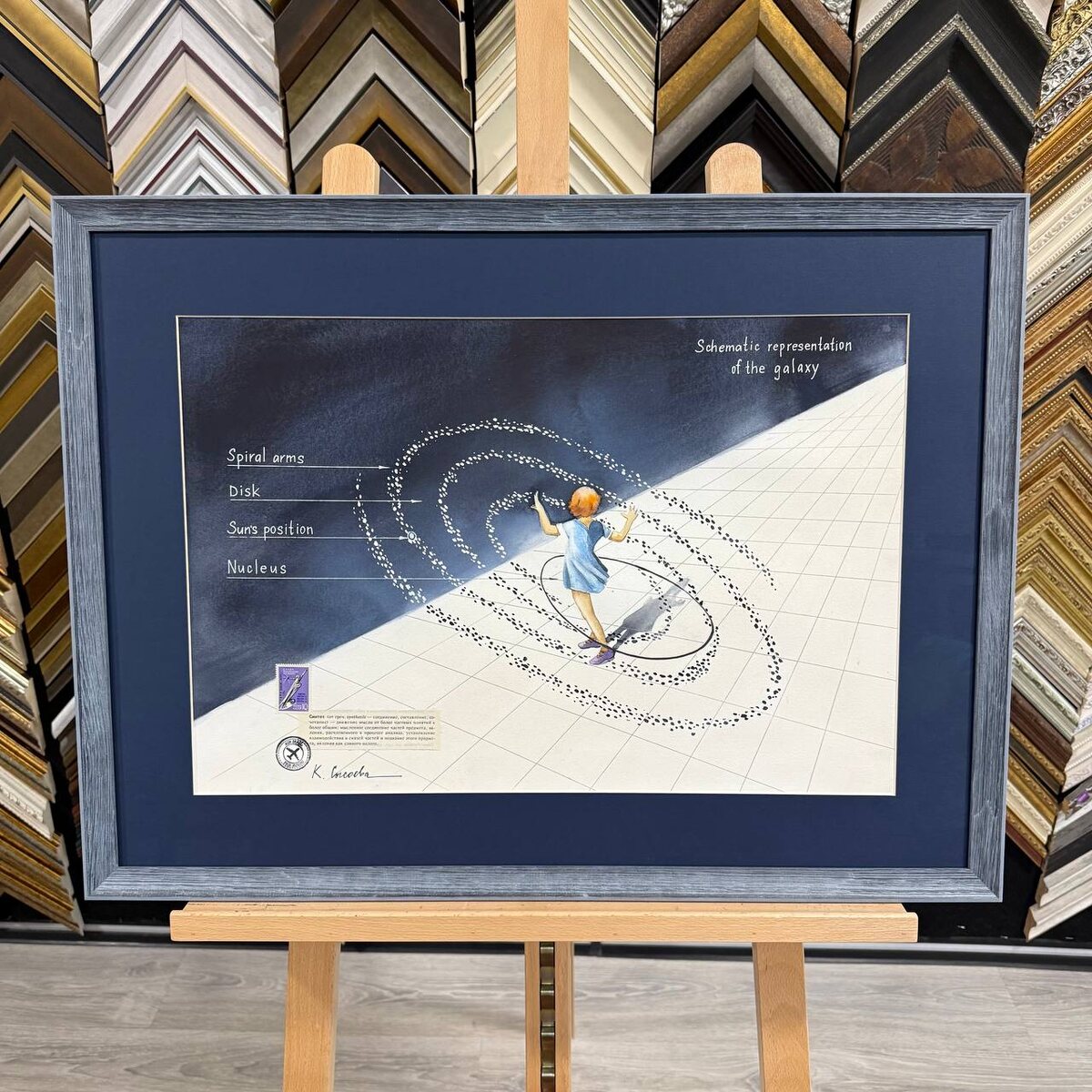 🎨 Оформили две работы художницы Кати Сысоевой. Первая — «Вращая Вселенную» — поэтичная и визуально точная композиция, где, как и во многих её работах, ощущается диалог с пространством в широком понимании: будто художник проецирует свои мысли, состояния и наблюдения в форме диаграмм, символов, а так же живых образов. Например в этой работе мы видим схему галактики и формулировку понятия "Синтез", которые связывает девочка с обручем. 📌 В оформлении использовано: — серо-синий деревянный багет, — тёмно-синее паспарту, — музейное стекло. Сдержанная цветовая гамма подчёркивает внутреннее движение и сосредоточенность работы, сохраняя воздушность и глубину. 👩🎨 Катя Сысоева — современная художница, работающая в Москве. Её работы — это визуальные размышления о времени, тишине, внутреннем космосе. Тонкий минимализм, геометрия и символизм делают каждое произведение узнаваемым и метафизически наполненным. 🖼 Арт-мастерская «Багетъ» 📍 Москва, Дмитровский пер., д. 4, стр. 1 🌐 bagetnayamas