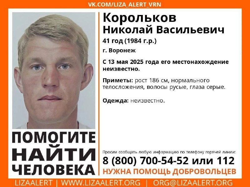 Внимание! Помогите найти человека! Пропал #Корольков Николай Васильевич, 41 год. г. #Воронеж С 13 мая 2025 его местонахождение неизвестно. Если вы обладаете какой-либо информацией о пропавшем, просьба позвонить по номеру телефона горячей линии отряда 88007005452 (бесплатно по РФ) или 112. ⚡️Подпишись на «Медиа-Х Воронеж»