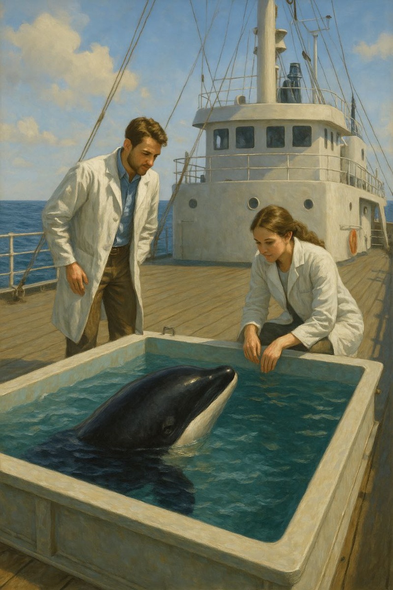 Шлюз с шипением разомкнулся. Внутри, на мокром полимерном ложе, лежало Существо. Формой отдаленно напоминало дельфина, но было массивнее, мощнее. Кожа – темно-свинцовая, с едва уловимым металлическим отливом, будто чешуя древнего воина. Но больше всего поражали глаза. Огромные, абсолютно черные, как сама бездна за иллюминаторами. И в них – не животный страх, а глубокая, осознанная тоска. Оно дышало тяжело, грудью, издавая низкие, вибрирующие звуки. Не привычные дельфиньи щелчки, а что-то... мелодичное. Грустную, заунывную песню.