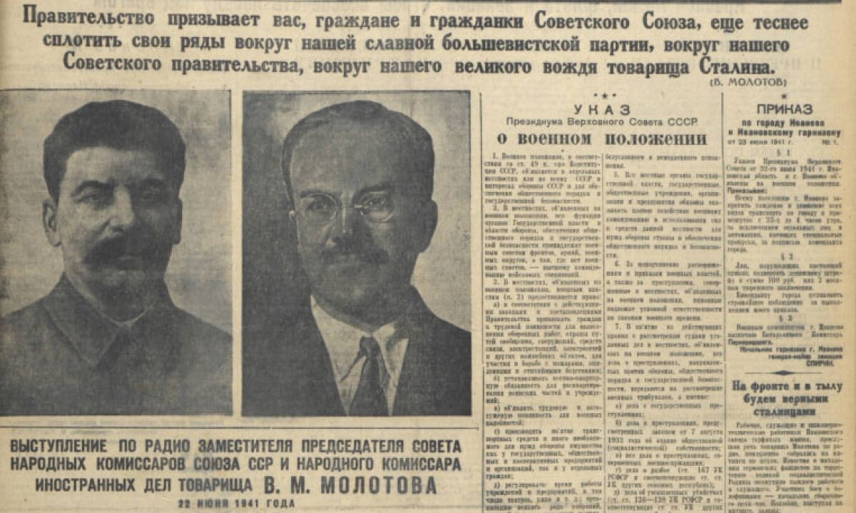 23 июня – второй день после начала Великой Отечественной войны. Второй день после нападения Германии на Советский Союз. «Ивановские новости» обратились к прессе того времени и выяснили, что происходило в 37-м регионе, и о чем писали наши газеты 23 июня 1941 года. Первая реакция - «Иваново готово к труду и обороне!» Люди уже услышали о начале военного положения по радио. Но в «Ивановской газете» на первой же полосе было продублировано обращение В.М. Молотова. Указ президиума Верховного Совета СССР о военном положении в газете «Рабочий край» На фронте и в тылу будем верными сталинцами» Призыв к народу звучал в каждой строке. В их числе и фраза «На фронте и в тылу будем верными сталинцами». 23 июня было издано множество указов, они нашли отражения на страницах ивановской прессы. Среди них указ президиума верховного совета СССР о мобилизации военнообязанных по Ленинградскому, Прибалтийскому, Западному, Киевскому, Одесскому, Харьковскому, Орловскому, Московскому, Архангельскому, Уральскому,