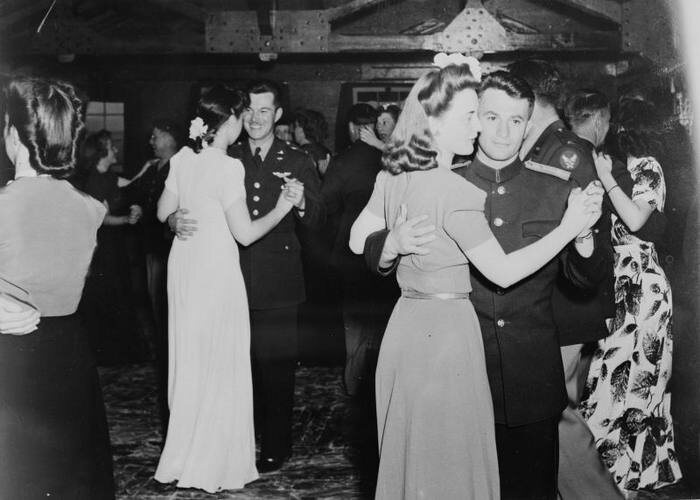 Советские и американские авиаторы танцуют с девушками в клубе аэродрома Ноум на Аляске. 1943 год.