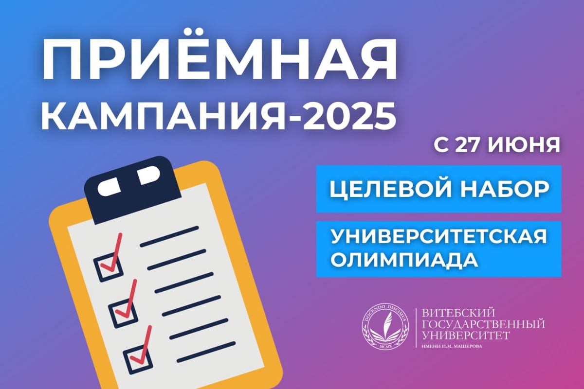 ⚡️В ВГУ имени П.М. Машерова 27-го июня начинается приём документов от абитуриентов-победителей университетской олимпиады-2025 и абитуриентов, поступающих на условиях целевой подготовки. 🔵Приём документов осуществляется: 🟢для победителей университетской олимпиады: с 27 июня по 1 июля; 🟢для целевого набора: с 27 июня по 2 июля. 🔵С перечнем документов, предоставляемых в приемную комиссию победителями университетской олимпиады, можно ознакомиться по ссылке 🔵С перечнем документов, предоставляемых в приемную комиссию абитуриентами, поступающими на условиях целевой подготовки, можно ознакомиться по ссылке ✍️Вступительные испытания для абитуриентов, поступающих на условиях целевой подготовки, будут проходить с 4 по 10 июля. Расписание собеседований, вступительных испытаний и программы вступительных испытаний доступны по ссылке ✅Зачисление победителей университетской олимпиады состоится 2 июля. Зачисление абитуриентов, поступающих на условиях целевой подготовки, состоится 11 июля. 🗓