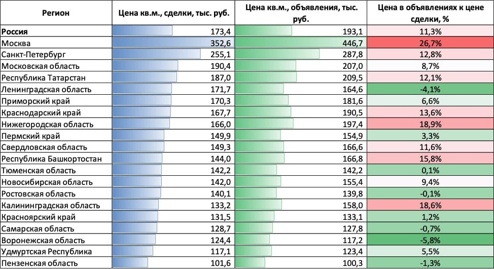 🪖 Средняя цена «квадрата» в новостройках выросла до 173,4 тыс. руб. — Домклик Разница между ценой в объявлении и итоговой сделкой сократилась до 11,3% — это минимум с декабря 2024 года. В Москве она по-прежнему максимальна — 26,7%. 👉Москва — 352,6 тыс. руб. 👉Санкт-Петербург — 255,1 тыс. руб. В отдельных регионах (Воронежская, Ленинградская и Пензенская области) цены в сделках оказались выше, чем в объявлениях.