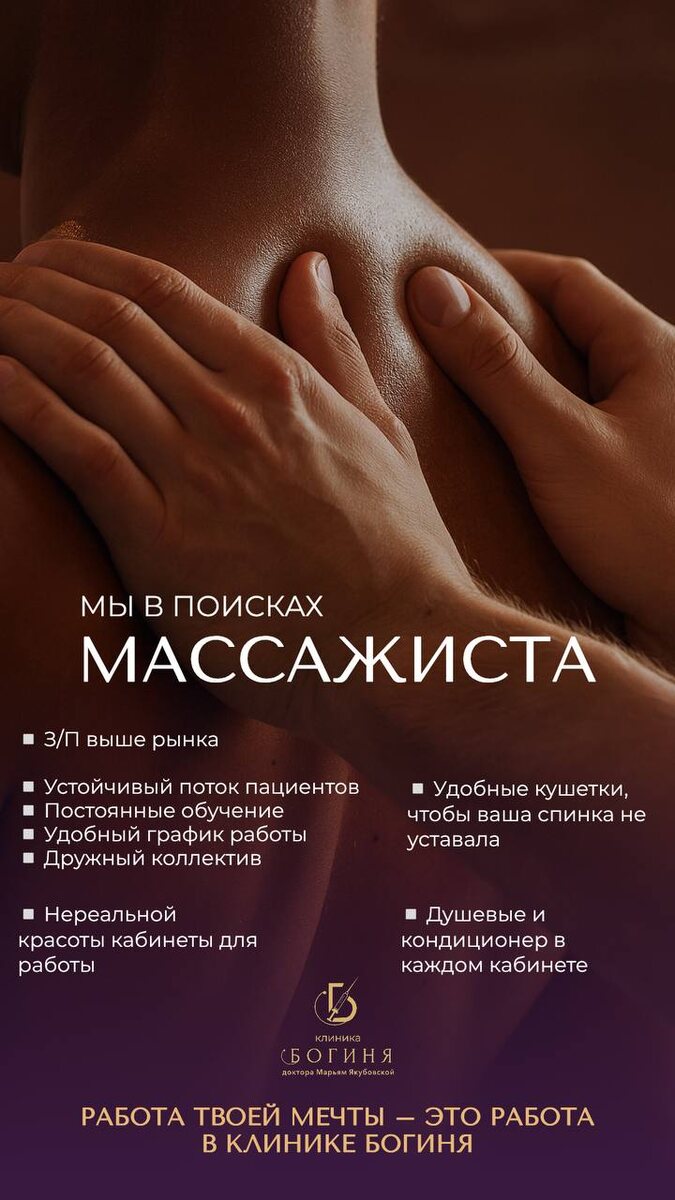 В нашу команду ищем сильного массажиста 💪🏼 У нас: — з/п выше рынка — поток пациентов обеспечен — стильная клиника и комфортные условия — команда, где ценят и поддерживают Если ты массажист с руками «от Бога» и хочешь достойно зарабатывать — добро пожаловать в БОГИНЮ. Пиши в директ — обсудим детали!