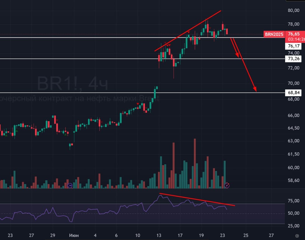 🛢 #Нефть #Brent #BR #bogdanoffinvest 🟢 Фьючерсный графи нефти. 4-х часовой тайм-фрейм. Есть хорошая дивергенция, а цели внизу в виде закрытия гэпа. Тут стоит учитывать, что любое слово Трампа может эту дивергенцию продлить дальше или сломать, но если эскалации конфликта не будет, то страхи уйдут из рынка, и цена на нефть будет падать. 🟢 А так же известно, что танкеры, находившиеся в пробке начали своё движение через Ормузский пролив.