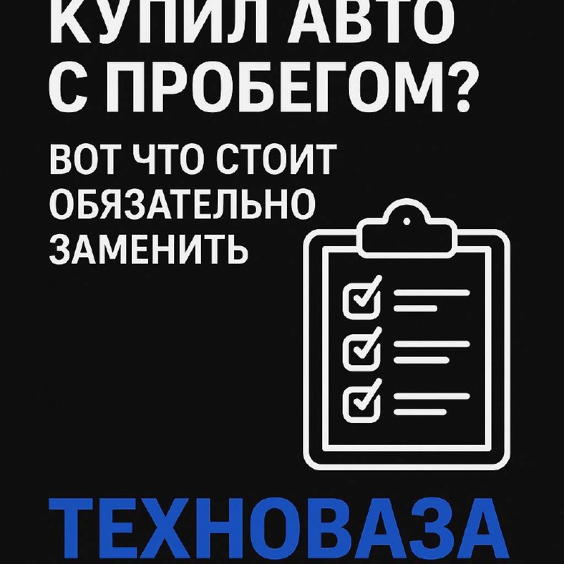 🧰 Купил авто с пробегом? Вот что обязательно нужно заменить Купил машину с рук? Отлично. Но не обольщайся: реальная точка отсчёта — не со слов продавца, а с твоей первой диагностики и замены ключевых узлов. ⸻ 🔧 1. Масло в двигателе + фильтры Почему важно: Никто, кроме тебя, не знает, что реально было залито в мотор. Даже если на СТО «ставили галочку» — могли сэкономить на качестве или подделать документы. Что менять: • моторное масло (по допуску двигателя), • масляный фильтр (оригинал или проверенный аналог), • воздушный и салонный фильтры, • топливный фильтр (особенно если дизель или GDI). 👉🏻 Совет от ТехноБазы: если машина простояла долго — добавь промывку перед заменой масла. ⸻ ⚙️ 2. Масло в коробке передач Почему важно: Автомат, вариатор или робот — без разницы. Даже если коробка «необслуживаемая» по паспорту, это не значит, что масло там волшебное. Оно теряет свойства, и последствия — дорогие. Что делать: • Полная или частичная замена масла, • замена фильтра коробки