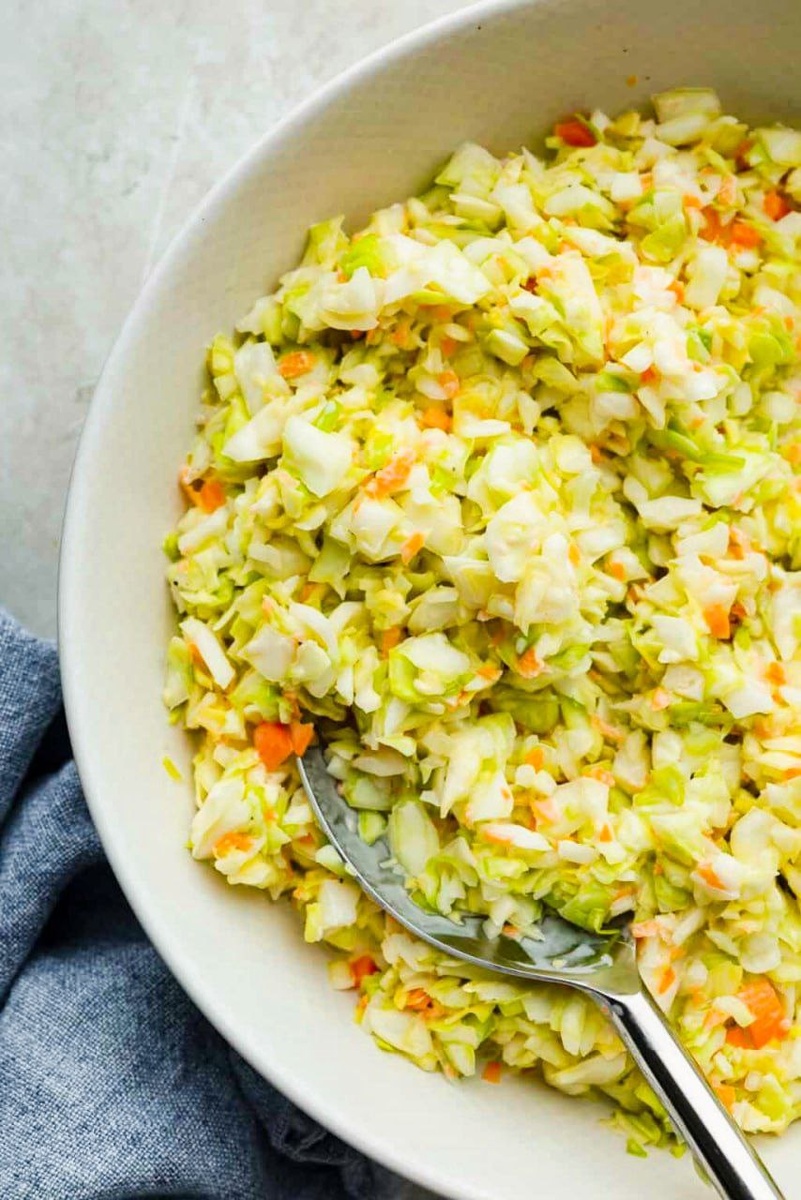 Этот салат станет универсальным гарниром или самостоятельным блюдом. Классический вариант "как в KFC" Ингредиенты (на 4-6 порций) Для салата Капуста белокочанная - 500-600 г (мелко нашинковать) Морковь - 1 шт. (около 100 г, натереть на крупной терке) Для заправки Майонез - 100 г Пахта - 2 ст. л. (или кефир с молоком 1:1) Молоко - 2 ст. л. Уксус белый дистиллированный - 1,5 ч. л. Сок лимонный - 2,5 ч. л. Сахар - 60-70 г Соль - 1/2 ч. л. Перец черный молотый - 1/8 ч. л. Способ приготовления В большой миске соедините нашинкованную капусту и тертую морковь.