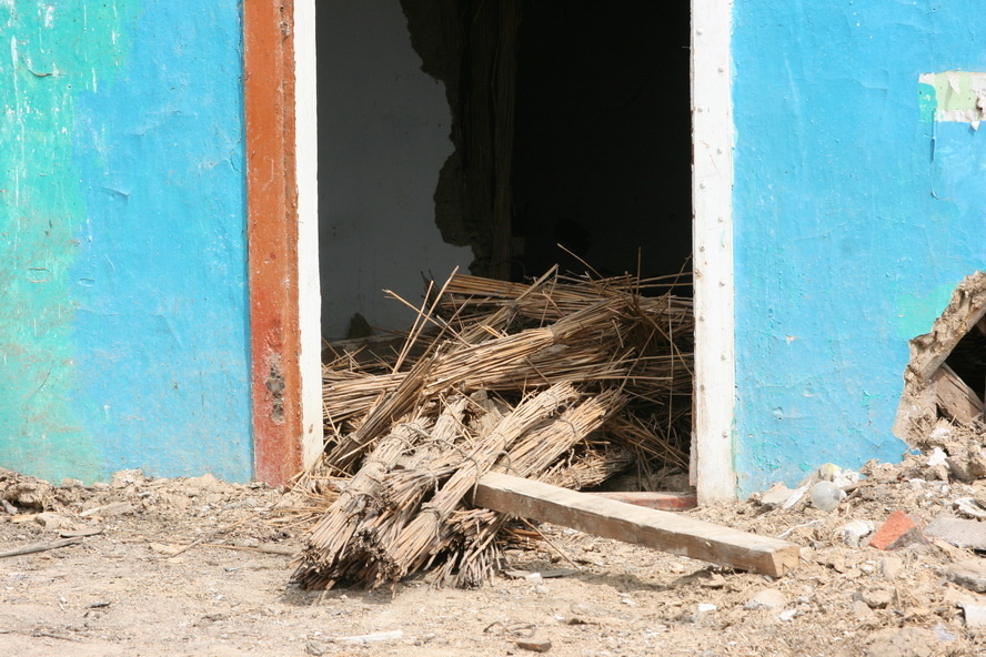 Когда то , году примерно 1978, моя свекровь рассказывала мне про то, как в деревне на Белгородчине жили до Великой Отечественной Войны. В этих южных областях дома тогда были большей частью саманные или набивные , а полы часто были земляные, крыши из соломы или камыша. Саман — это большие блоки, как сейчас газоблоки, только из глины смешанной с навозом и соломой. А набивные дома, это стены из решётки из досок, веток и камыша набивались тоже глиной. На фотографии видно пучки камыша из стен на которые набивали глину. Земляные полы, это утрамбованная земля и глина , которые покрывались регулярно жидкой глиной с навозом. Так как такие полы выбивались, трескались, потому и замазывали и регулярно смачивали, что бы пыль не поднималась. В этих домах отлично разводились мыши и земляные блохи. Земляные блохи — малюсенькие чёрные, почти как зёрнышки мака, но кусались больно. Они нападали на открытые части тела толпами. Как говорила свекровь;-» Ночью спустишь ноги с кровати на пол, что бы выйти