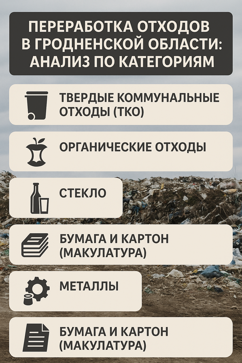 Рекомендуемые меры: Региону следует продолжить развитие инфраструктуры: своевременно запустить комплексы в Лиде, Волковыске, Сморгони и линию RDF в Гродно. Рассмотреть строительство заводика по компостированию органических отходов (например, на базе коммунального хозяйства в Гродно или Лиде) – по примеру пилотной линии компостирования зелёных отходов в Минске. Необходимо усилить работу с населением по сортировке – стимулировать раздельный сбор (материально и информационно), внедрять разделение пищевых отходов (начав с организованных территорий: рынки, кафе, крупные жилмассивы). Экономически важно повышать плату производителей за неперерабатываемую упаковку, чтобы финансировать переработку. С точки зрения экологии, перспективная система (к 2030 г.) – это до 70% использование ТКО (материалы + энергоутилизация) против ~30% сегодня, что сократит нагрузку на полигоны более чем вдвое. Экономический эффект проявится в виде сэкономленных ресурсов (замещение сырья вторичными материалами) и новых рабочих мест в индустрии переработки. Экологический эффект – уменьшение свалочного загрязнения, сокращение выбросов парниковых газов (метана с полигонов) и чище окружающая среда. В сумме, грамотное обращение с ТКО превращает проблему мусора в возможности для экономики замкнутого цикла.