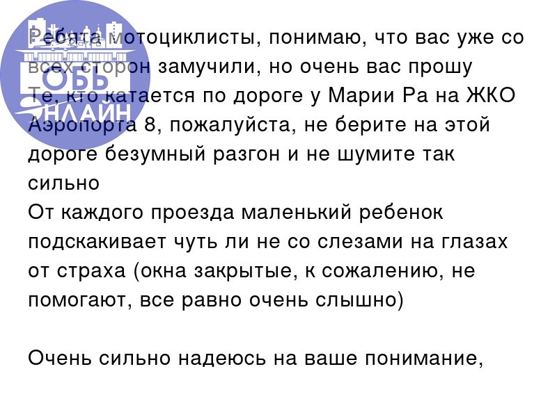 ↗ Ребята мотоциклисты, понимаю, что вас уже со всех сторон замучили, но очень вас прошу 🙏🏼 Те, кто катается по дороге у Марии Ра на ЖКО Аэропорта 8, пожалуйста, не берите на этой дороге безумный разгон и не шумите так сильно От каждого проезда маленький ребенок подскакивает чуть ли не со слезами на глазах от страха (окна закрытые, к сожалению, не помогают, все равно очень слышно) Очень сильно надеюсь на ваше понимание, добра❤️ vk.com Подробнее на https://vk.com/ob.gorod #городобь #городобьонлайн #толмачево