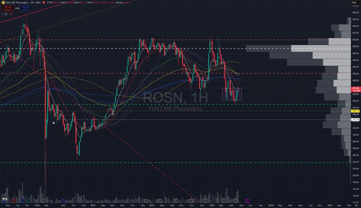 📉 $ROSN $LKOH — Иллюзия роста в нефтянке Может показаться, что у наших нефтяников есть какие-то перспективы. Но это только кажется. 🛢 Лукойл: уже почти год — чистейшая раздача. 🛢 Роснефть: второй год в боковике, и главное — без обновления максимумов. Это если смотреть глобально. А если сузить масштаб — последние месяцы показывают устойчивый нисходящий тренд. И что самое интересное: на фоне новостей по Ирану в этих бумагах неожиданно всплеск интереса у физиков. Но это не сигнал роста. Это сигнал слива. Крупные игроки туда не заходят. Зато пользуются ситуацией и сгружают объемы, переливая бумагу на плечи частных инвесторов. Те, в свою очередь, не торопятся продавать — и тем самым затягивают удавку сами на себе. 🔻 Лукойл: мои ожидания давно известны — “Голова и плечи”, фигура ещё жива, и ничто её пока не сломало. Я не знаю, на чём он туда придёт, но знаю, по какой цене он снова станет интересен — ближе к 4000 ₽. Никакой героической “досидки до нуля”. Если и брать под будущие див