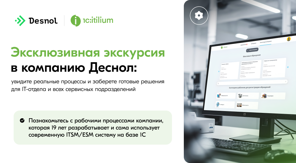 Увидеть это в действии можно на онлайн-экскурсии в IT-отделе 1С:ITILIUM компании «Деснол» — разработчика и интегратора экосистемы 1С:ITILIUM. За 1 час вы получите полное представление о том, как: — организован приём и обработка заявок по ITIL — с автоматическим распределением, эскалациями и контролем сроков;