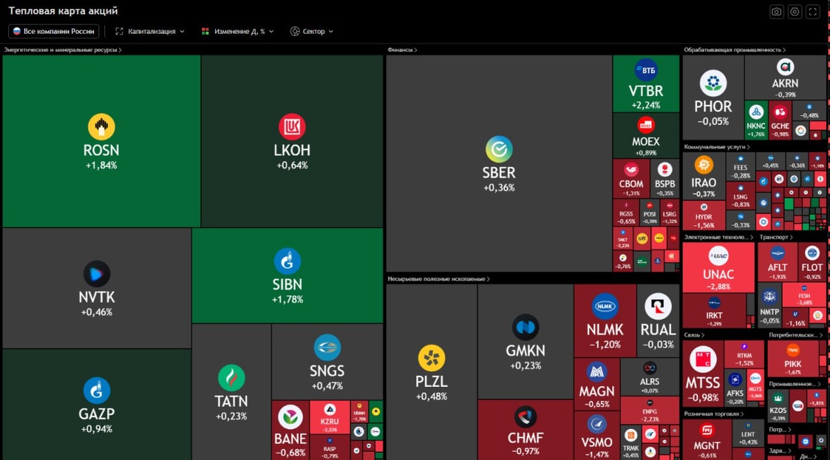 🟢 Индекс Мосбиржи вынырнул в зеленую зону, и в настоящий моменте показывает +0,45%, но тепловая карта показывает, что рынок торгуется очень неравномерно.