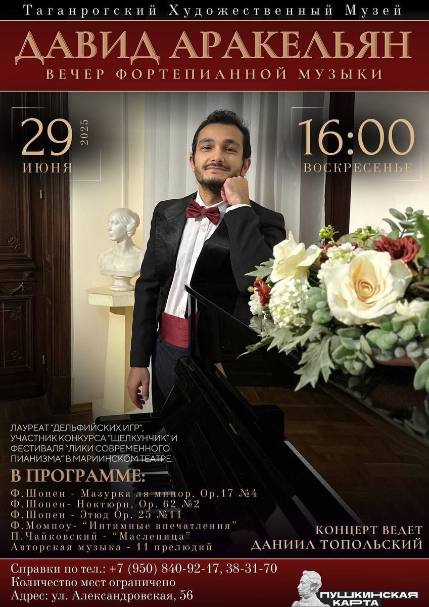 «Вечер фортепианной музыки» из цикла «Как слушать классику». 29 июня в 16:00 в Таганрогском Художественном Музее. Давид Аракельян - талантливый пианист, лауреат более 50 различных музыкальных конкурсов, лауреат «Дельфийских игр»; участник конкурса «Щелкунчик», фестиваля «Лики современного пианизма» в Мариинском театре. Выпускник Ростовской консерватории им.С.В.Рахманинова! Виртуозную игру Давида будут сопровождать истории, связанные с произведениями. Раскроется музыкальный язык, художественная и эстетическая составляющая. Цель концерта-лекции сделать классическую музыку доступнее и понятнее для наших зрителей. Чтобы она не просто звучала, а рассказывала свои истории звуками. Концерт-лекцию ведёт Д. Топольский. В программе произведения Ф.Шопена, П.И.Чайковского, Ф.Момпоу и авторская классическая музыка. Ждем Вас! 🤍