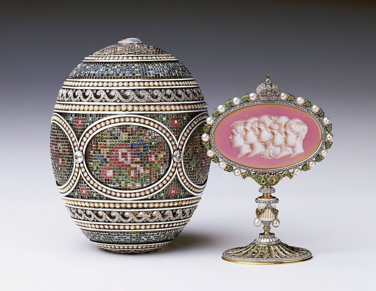 Ещё одним шедевром Альмы стало яйцо «Мозаичное». Вкрапления драгоценных камней в металлическую основу корпуса яйца имитировали ручную вышивку, которой занимались практически все девушки в то время. Сюрпризом были профильные портреты пятерых детей Александры Федоровны и Николая. Николая II, всё того же 🤗