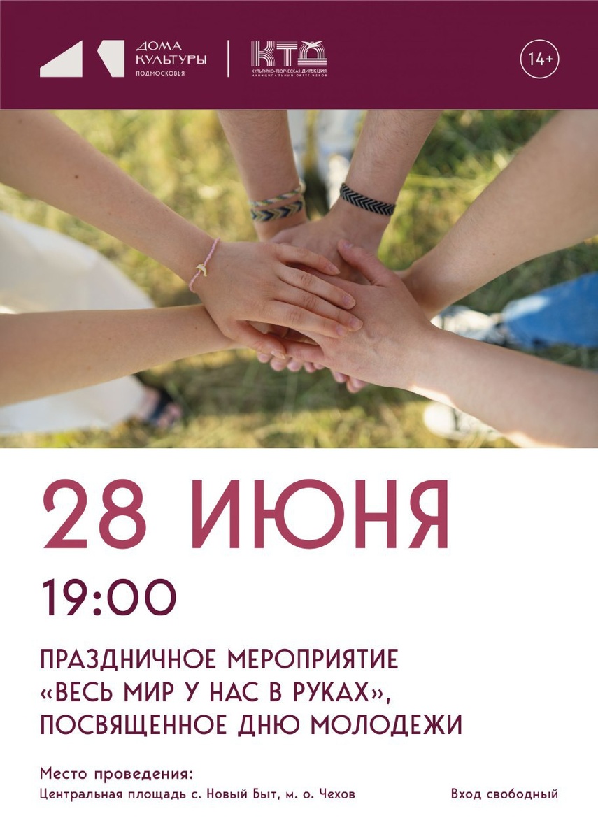 ✨ Ко Дню молодежи в с. Новый Быт Молодежь, мы ждем тебя. Приходи, будет интересно 🌞 🚫 Возраст: 14+ 📆 28.06.2025 🕛 19:00 🏢 ДК «Меридиан» 📍 г.о. Чехов, с. Новый Быт, ул. Новая, д.8а 🪙 Вход свободный❗️ #webЧехов ⭐Разместить публикацию ⭐Поддержать канал голосом ✅ Мероприятия Чехов https://dzen.ru/id/66cc4b48e9ef144699238a51 http://vk.com/chekhov_events http://dzen.ru/chekhov_events