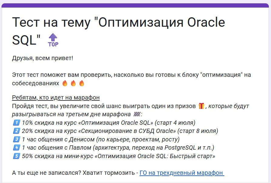 Тест на знание Оптимизация Oracle SQL – проверь себя! ✅ Друзья, всем привет! 👋🏻 Как вы думаете, хорошо ли вы разбираетесь в Оптимизации Oracle SQL? Или, может быть, пора обновить знания? Для вас я подготовил тест, который подойдет как новичкам, так и опытным разработчикам. Что вас ждет в тесте ❓ 🔶 Практические задачи, которые встречаются в повседневной жизни 🔶 Вопросы, которые задают на собеседовании 🔶 Задачки с подвохом 🔗 Ссылка на тест 👈👈👈 💡 А что дальше? Мы не просто так даем вам этот тест. Уже завтра стартует марафон Оптимизация Oracle SQL, где мы вместе разберем все вопросы теста и подробно объясним ответы. 🚀 Что будет на марафоне? ✅ Как правильно читать план запроса, последовательность операций ✅ Mock-собеседование по Оптимизации ✅ Разбор ТОП-вопросов на собесах ✅ Разберем задачу с собеседования со Спортмастера ✅ Как правильно отвечать на мозговыносящие Soft-вопросы ("кем вы видите себя через 5 лет", "назовите свои слабые стороны" и т.д.) ✅ Советы по поводу то