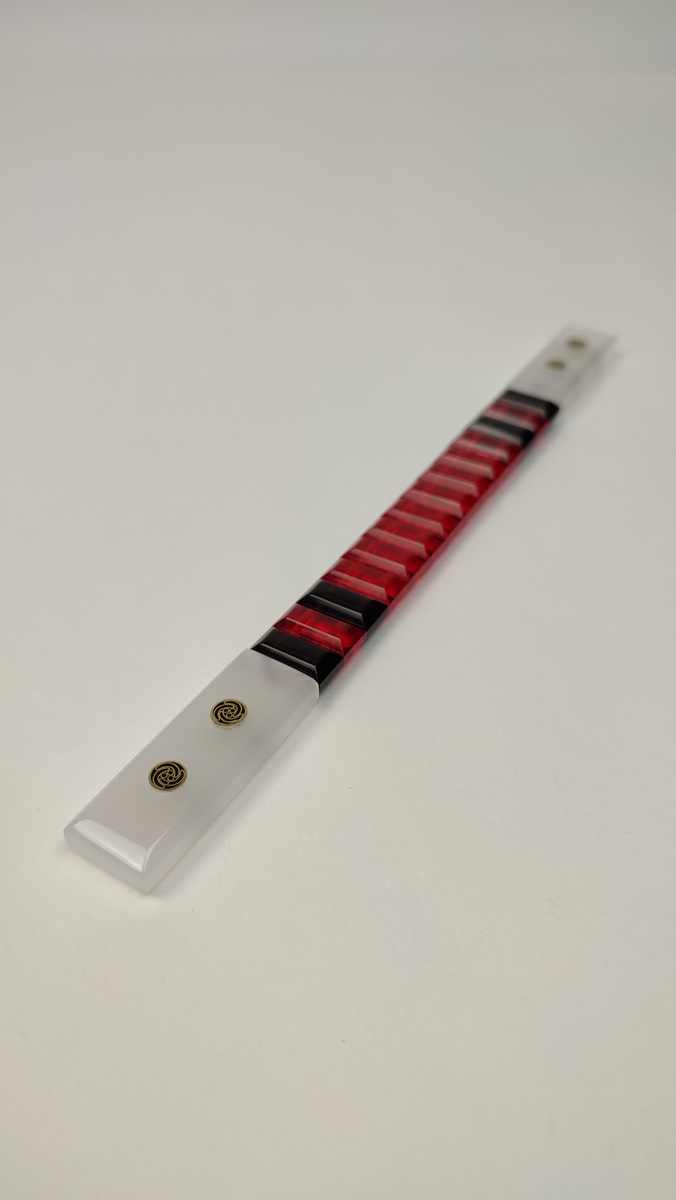 толщина ~ 7−8 мм. В конечники добавлены пины - 4 шт по 5 мм Рубиновая основа — жгучая, живая, застывшая в момент решимости. Чёрные вставки — строго симметричны, уравновешивают пыл и придают ритм. Молочные конечники — холодная гладь, спокойствие. Завершают образ две пары пинов, как акценты, как уверенные точки в финале фразы. Это чётки для тех, кто ценит равновесие между светом и тенью, импульсом и контролем. Их не просто крутят — они помогают найти баланс