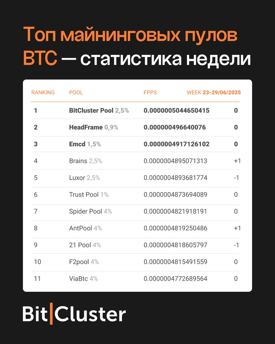 Публикуем первую еженедельную сводку доходности (FPPS) — сколько приносят пулы при равных условиях. Теперь каждый понедельник. Полная подборка — на сайте 🔗 Присоединиться к пулу BitCluster