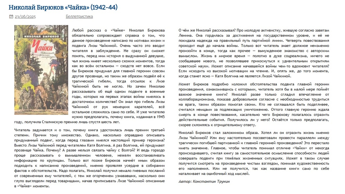 Николай Бирюков "Чайка" (1942-44) | Критика