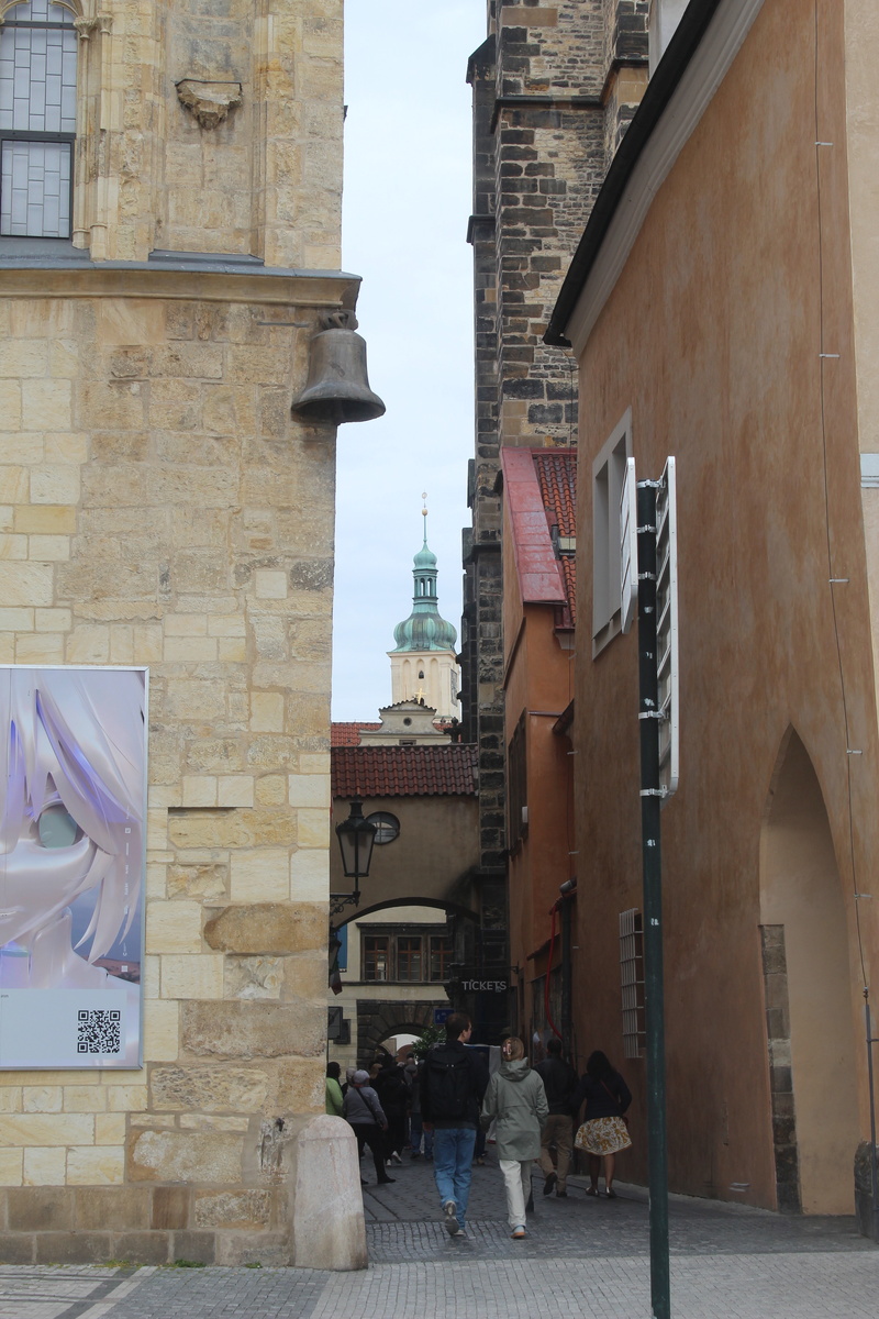 О самой Староместской площади немного написал здесь Если с утра того майского дня погода была весенней, то через некоторое время она стала напоминать осеннюю. Но дождь все еще не начинался, и от Староместкой площади я пошел сначала на северо-восток. Нырнул в не очень заметный проход между домами. Прошел по узкой улочке - а это именно улочка, - мимо стены костела Богоматери пред Тыном. И оказался в месте, которое называется Тын. Другое его старинное название, немецкоязычное - Унгельт. Когда-то здесь располагался двор для купцов из дальних земель, где они должны были платить пошлины, могли хранить товары и жить. О нем на моем канале есть отдельная статья Заезжих купцов здесь давно нет. По большей части, тут теперь туристы. Соответственно, вместо складов и сборщиков пошлин - выставки, музеи, кафе, магазины. Видели кресты на Староместской площади? Они напоминают о том, как в 1621 году там казнили вождей восстания против власти династии Габсбургов. Один из лидеров мятежников, Вацлав Будовец