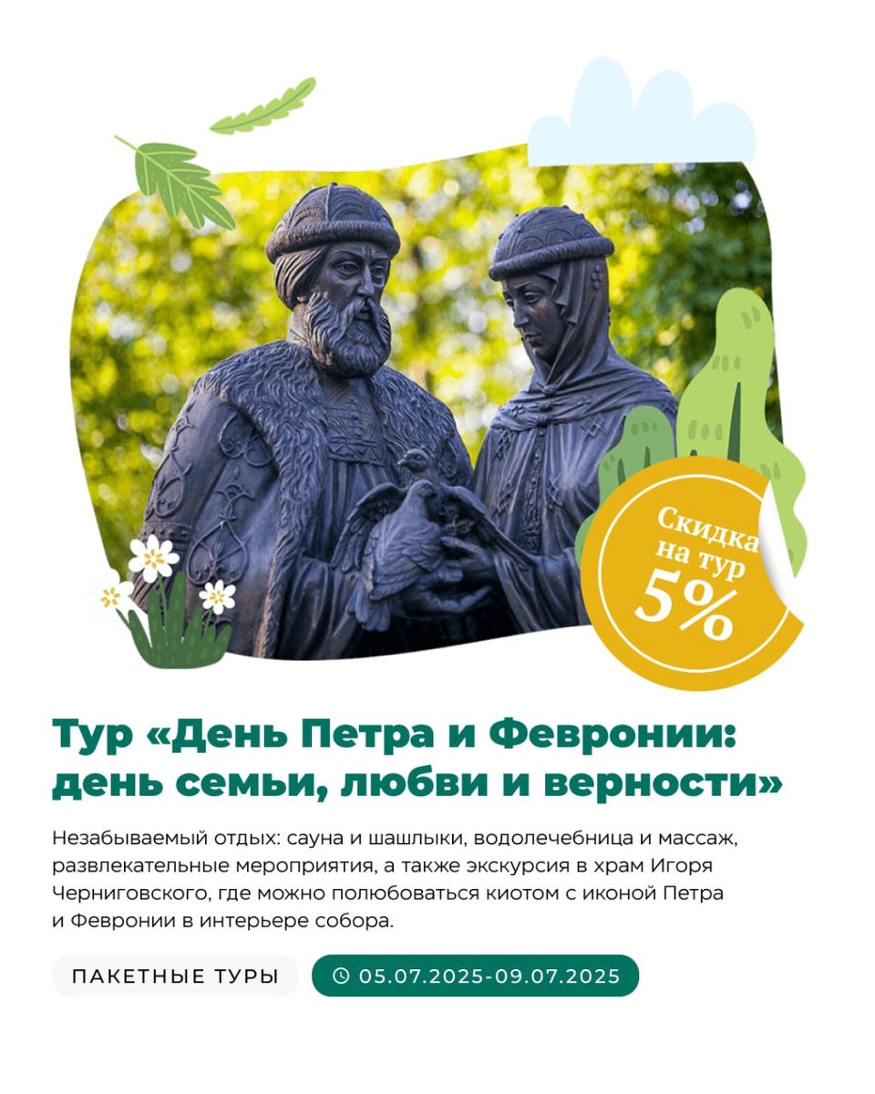 Тур «День Петра и Февронии: день семьи, любви и верности» ❤️ Приглашаем на незабываемый отдых в «Переделкино»: сауна и шашлыки, водолечебница и массаж, развлекательные мероприятия, а также экскурсия в храм Игоря Черниговского, где можно полюбоваться киотом с иконой Петра и Февронии в интерьере собора. 📅 Даты тура: 05.07.2025 — 09.07.2025 🚖 Бесплатный трансфер от метро Переделкино. 🎤 В программе: мастер-классы, развлекательные программы и викторины, киносеансы, дискотека, игры на свежем воздухе. 4-разовое питание по системе «шведский стол». 📋 Подробная праздничная программа Узнайте подробности и оформите бронирование по телефону 📞 +7 (495) 105-90-92