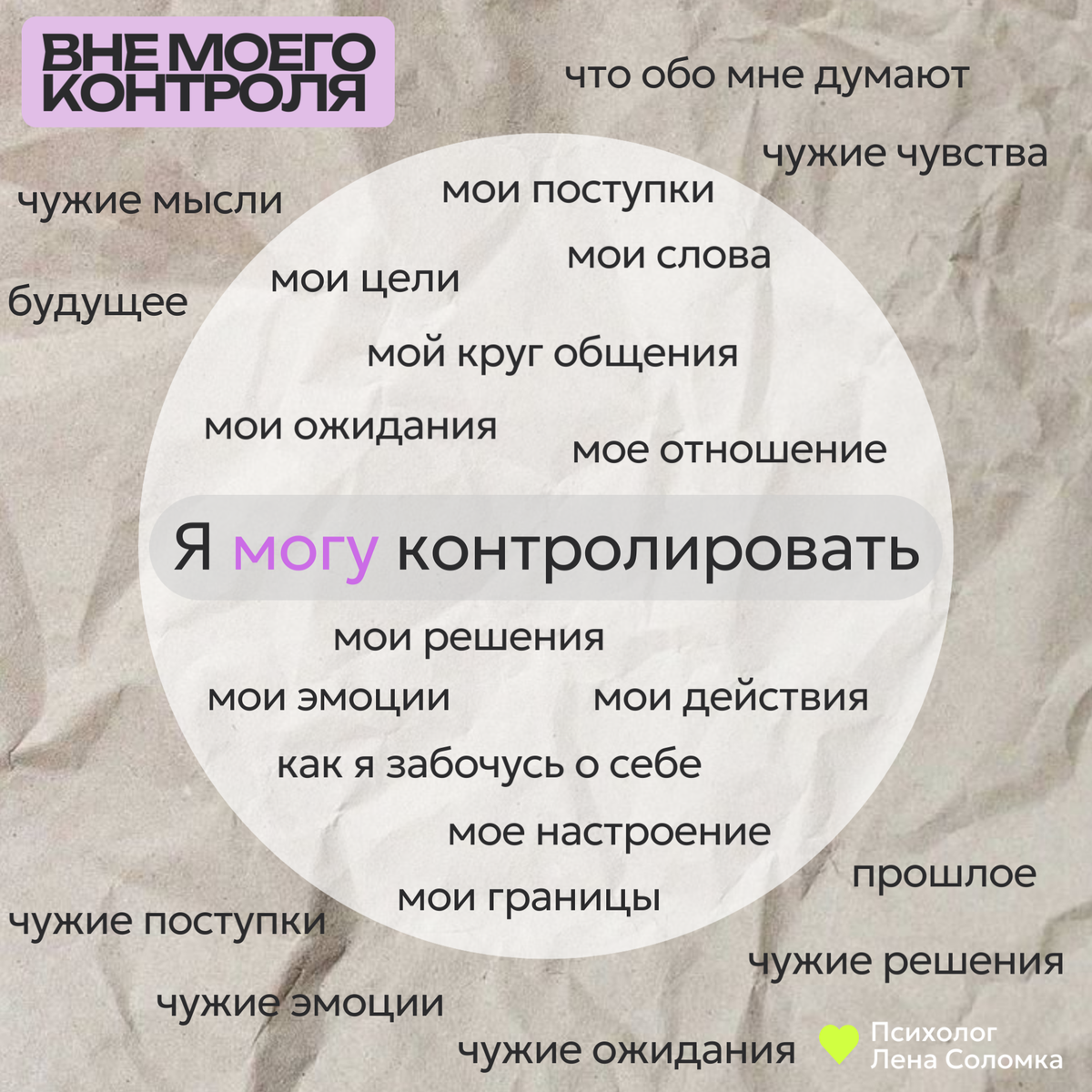 Иногда мы теряем кучу энергии на то, что совершенно вне нашей власти: чужие мысли, эмоции, поступки, мнение о нас, прошлое, будущее. И чем больше мы пытаемся это «починить», тем сильнее ощущаем тревогу. Но стоит только направить внимание внутрь - на то, что действительно зависит от нас, - как возвращается ощущение стабильности и опоры. - свои поступки и слова - свои решения и эмоции - как я забочусь о себе - свое настроение - свои границы и круг общения - свои цели, ожидания и отношение к происходящему - чужие мысли и чувства - прошлое - чужие ожидания, действия и решения - что обо мне думают Да, это про бессилие. Иногда хочется «починить», чтобы все было понятно, логично, по-доброму. Но люди - не механизм, и не приложение с настройками. - как мы реагируем - как мы говорим - что выбираем: остаться, уйти, объяснить ещё раз или поставить границу - как мы заботимся о себе после сложного общения - как мы разрешаем себе не спасать всех подряд Когда перестаешь бороться с тем, что не поддаетс