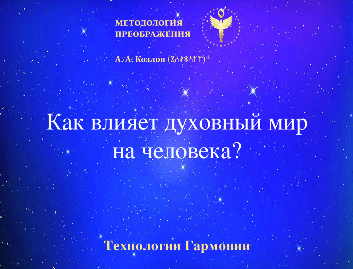 Как влияет духовный мир на человека? Когда появляется атмосфера чистоты, любви и содружества? Про путь Со-Творца. На вопросы отвечает Александр Анатольевич Козлов – автор Методологии Преображения. «Открывая для себя духовный мир, человек уходит от проявлений эго, борьбы, соизмерения, двойственности, поднимается над принципом неосуществления и формирует в себе светоносный кристалл триединства, проявляющийся гармонией мужского, женского и сыновнего начал. Гармония и единение мужского и женского начал создают особую атмосферу чистоты, любви и содружества. Это состояние внутреннего равновесия, устойчивого баланса позитивных энергий, которые проявляются целостностью аспектов воли и любви двух начал в едином сосуде жизни. Такое наполнение создает благоприятные условия для пробуждения и раскрытия аспекта сына, который начинает проявлять сначала творчество, а затем выходит в Со-Творчество, трансцендируя творческий потенциал в единое движение с Мировой Волей по созиданию нового, формируя Путь С